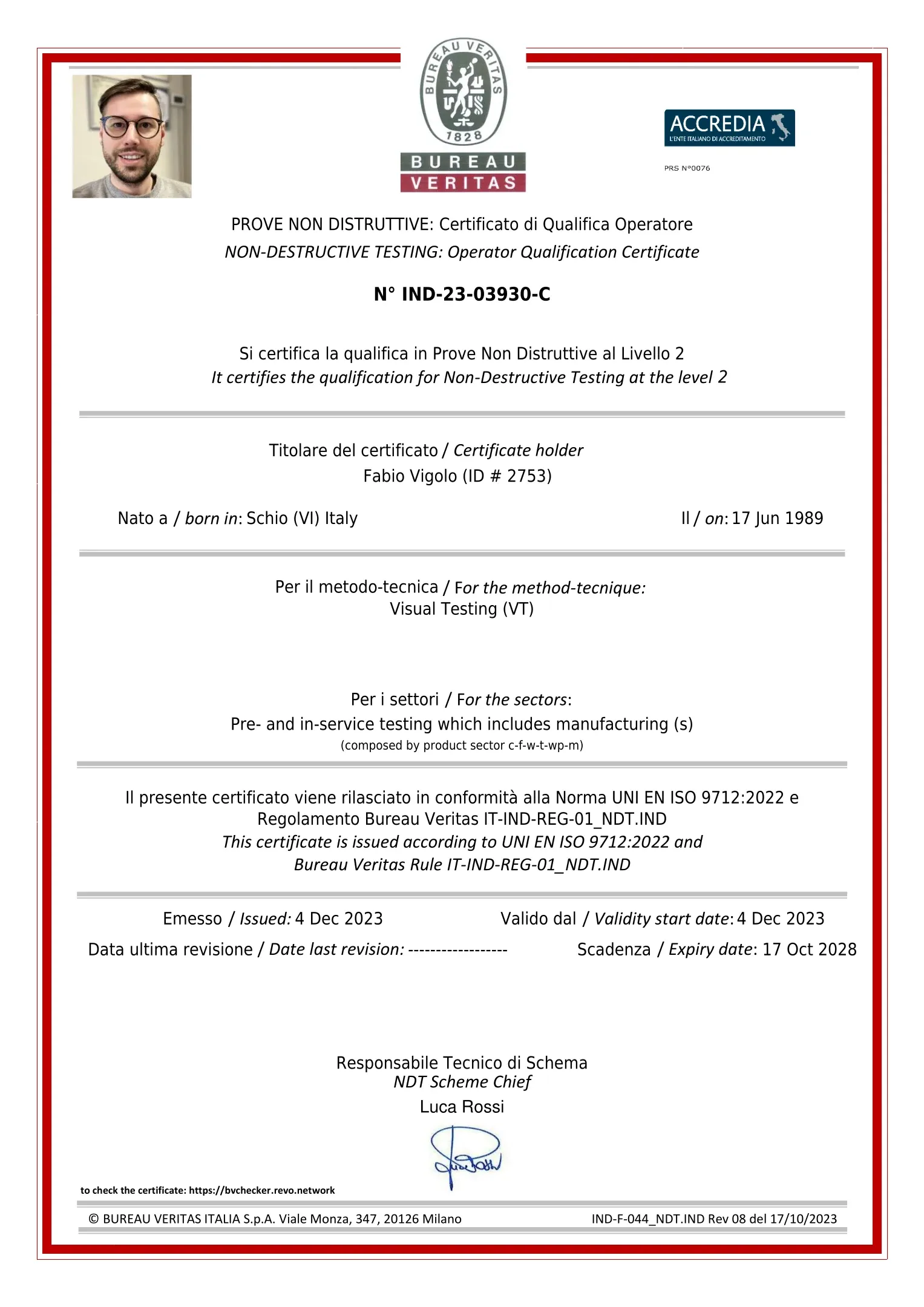 Il Sig. Fabio Vigolo è in possesso del Certificato di Qualifica Operatore per Prove Non Distruttive di Livello 2 rilasciato da Bureau Veritas Italia S.p.A., che attesta la sua competenza nell'esecuzione di controlli Visual Testing (VT).