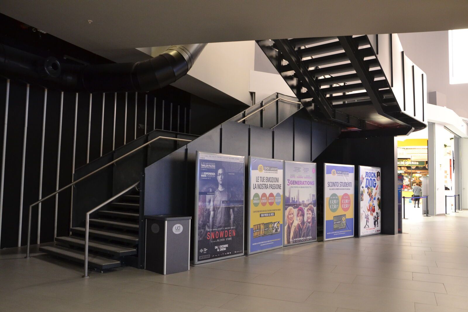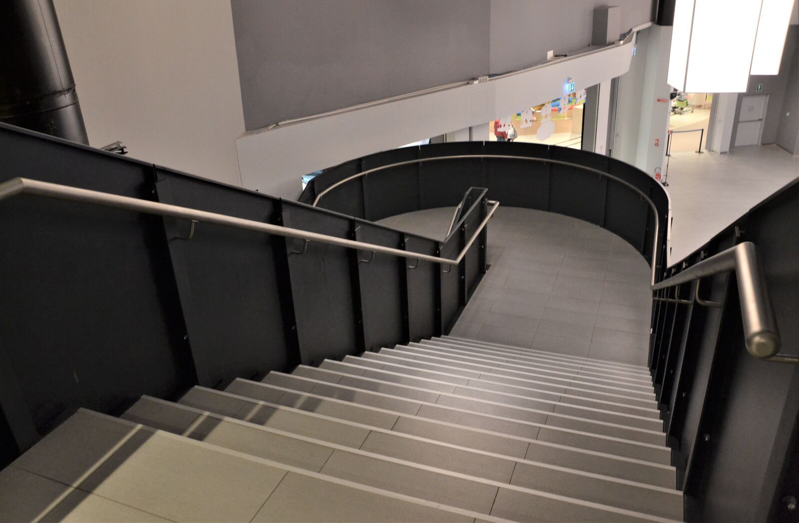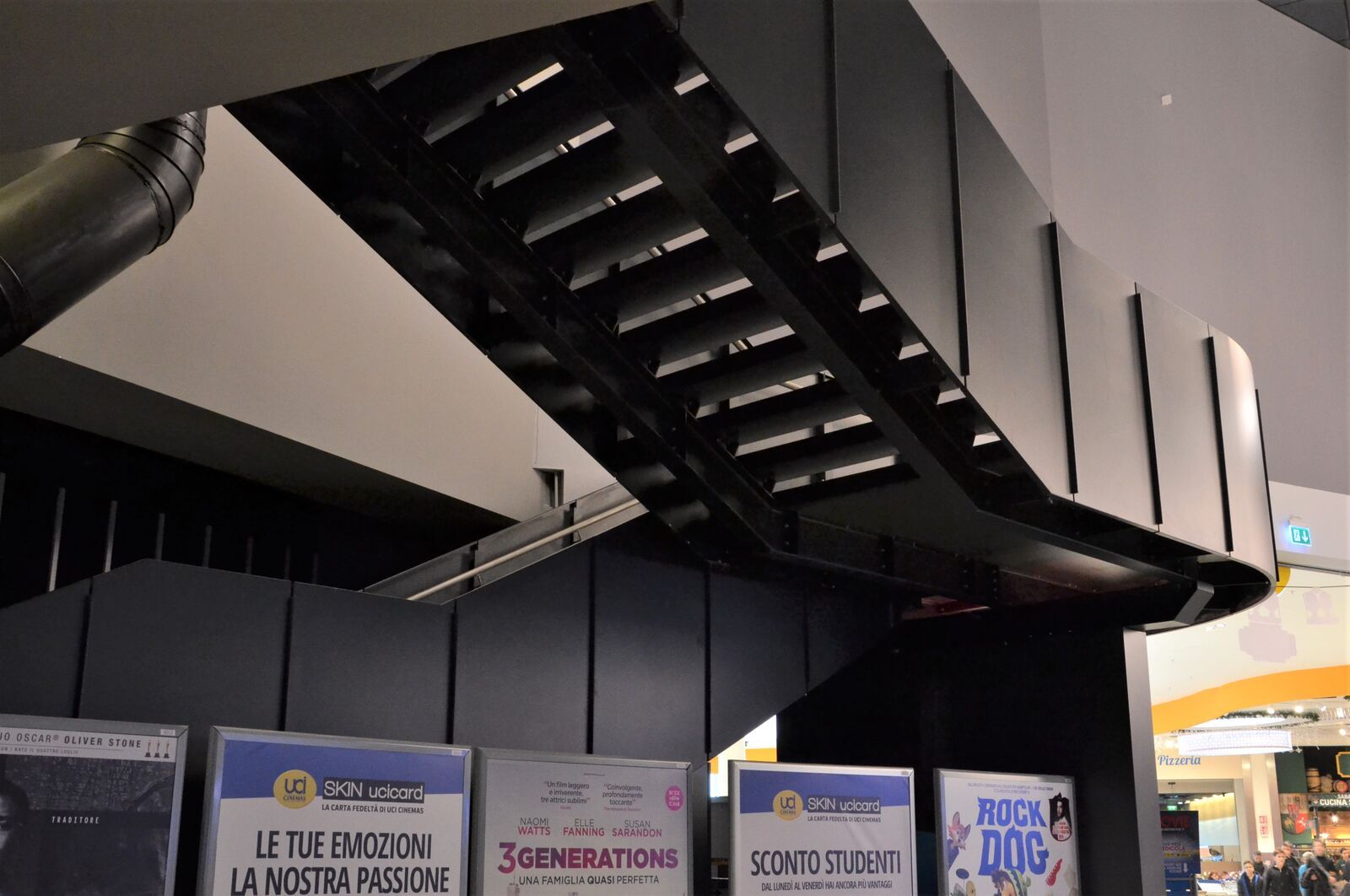 Abbiamo realizzato una scala architettonica con corrimano in acciaio inox e piastrelle in gres per il favoloso Uci Cinema di Villesse a Gorizia.