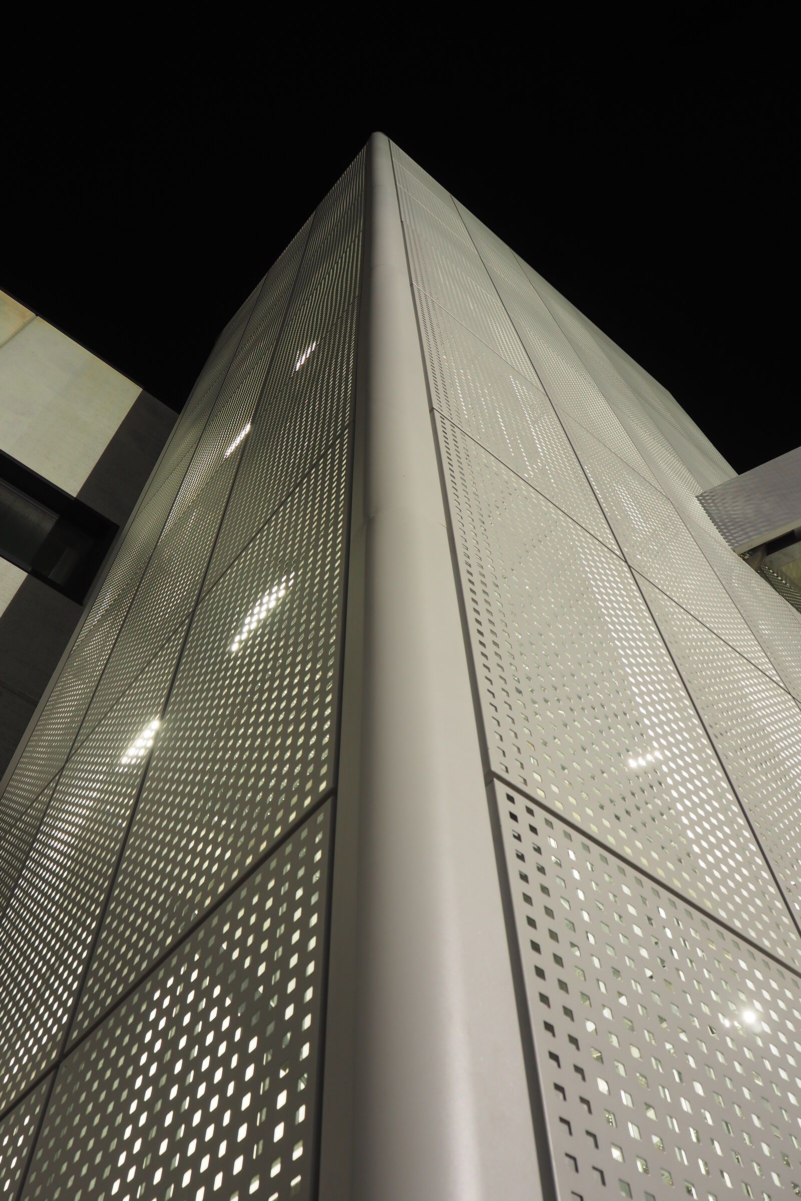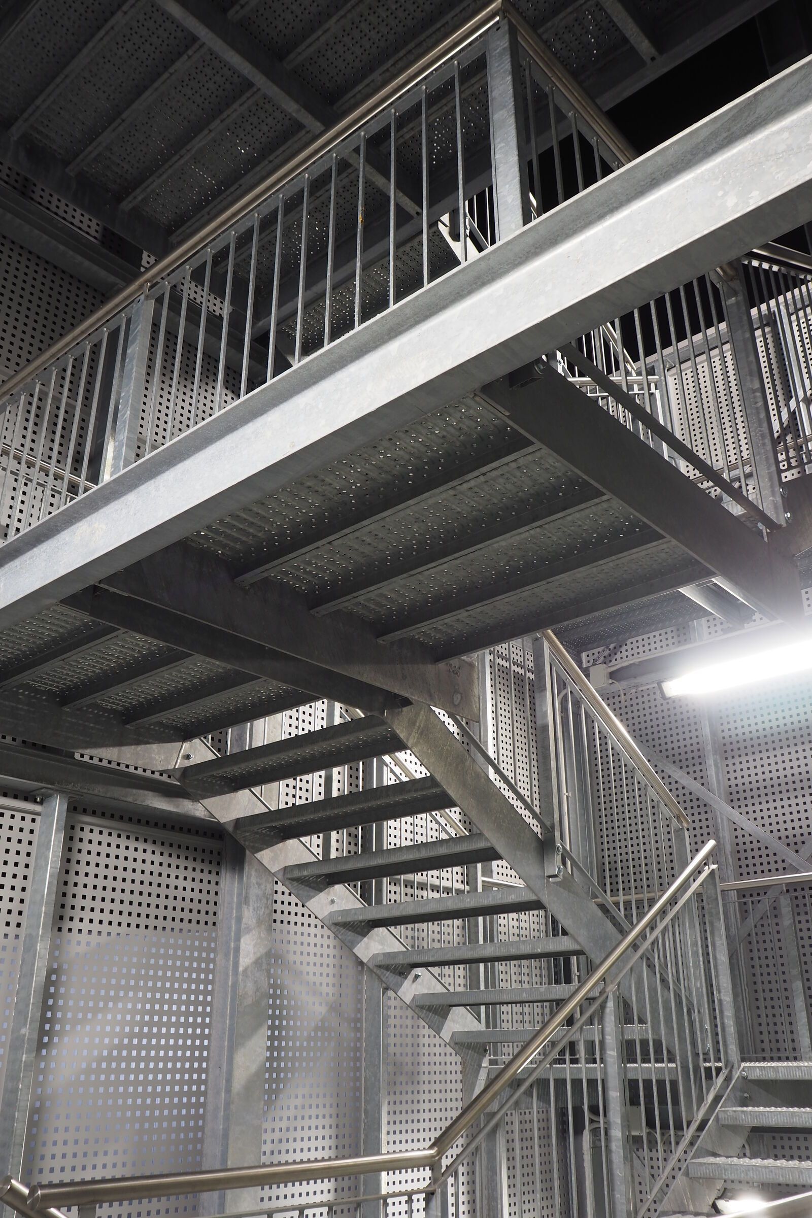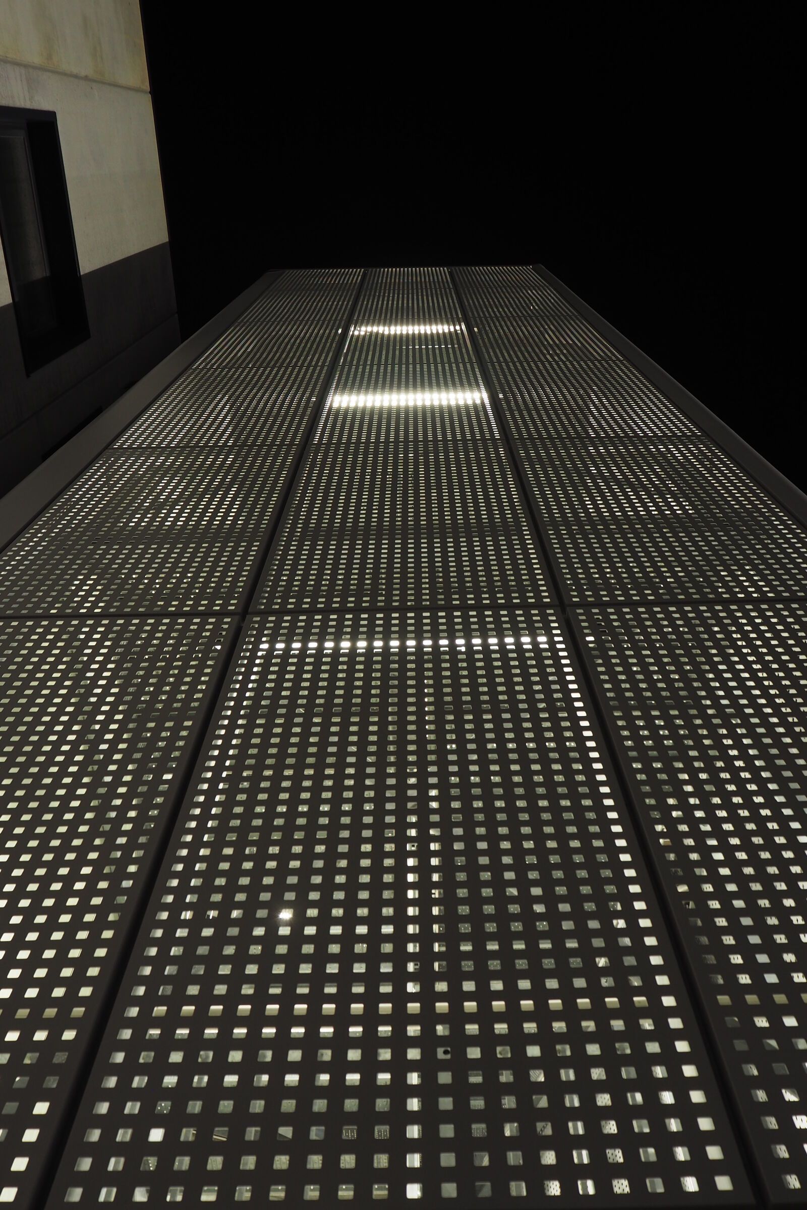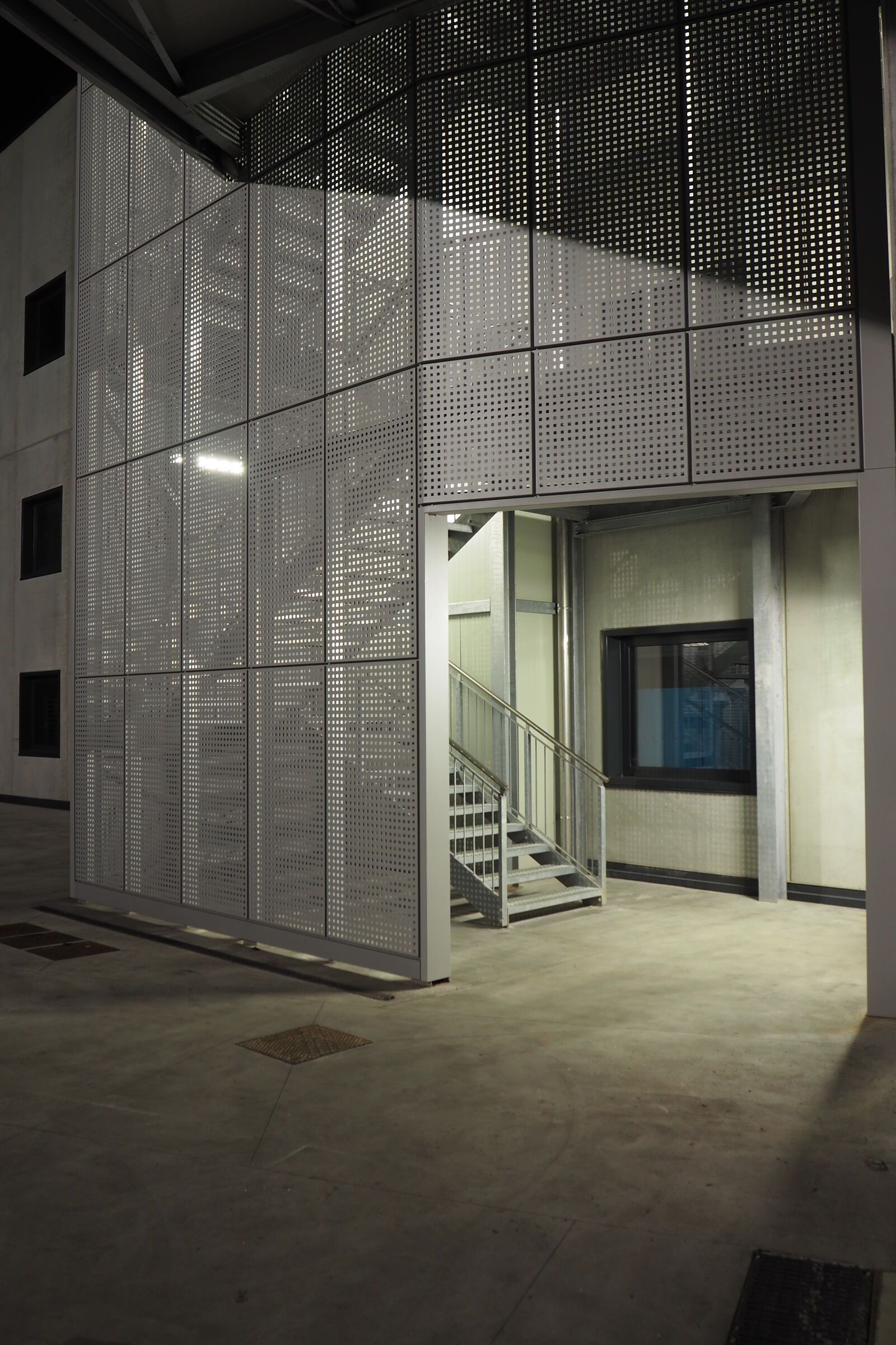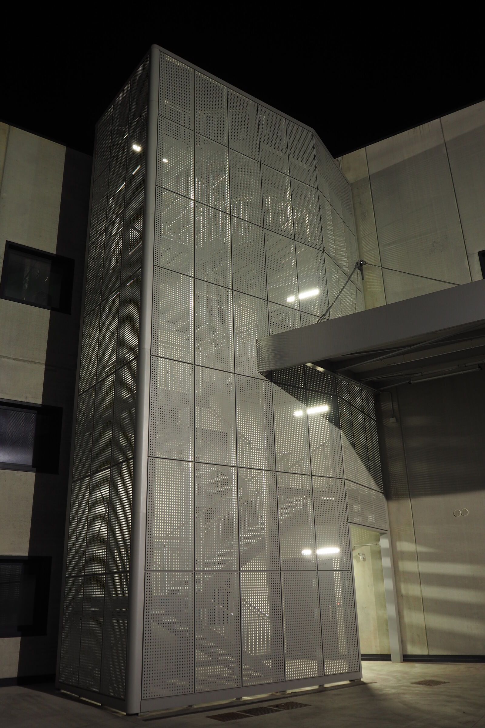 Per valorizzare l'estetica, la scala è stata rivestita con delle lamiere di alluminio forate, che la fanno intravedere solo nelle ore notturne grazie all'illuminazione con luci al neon.