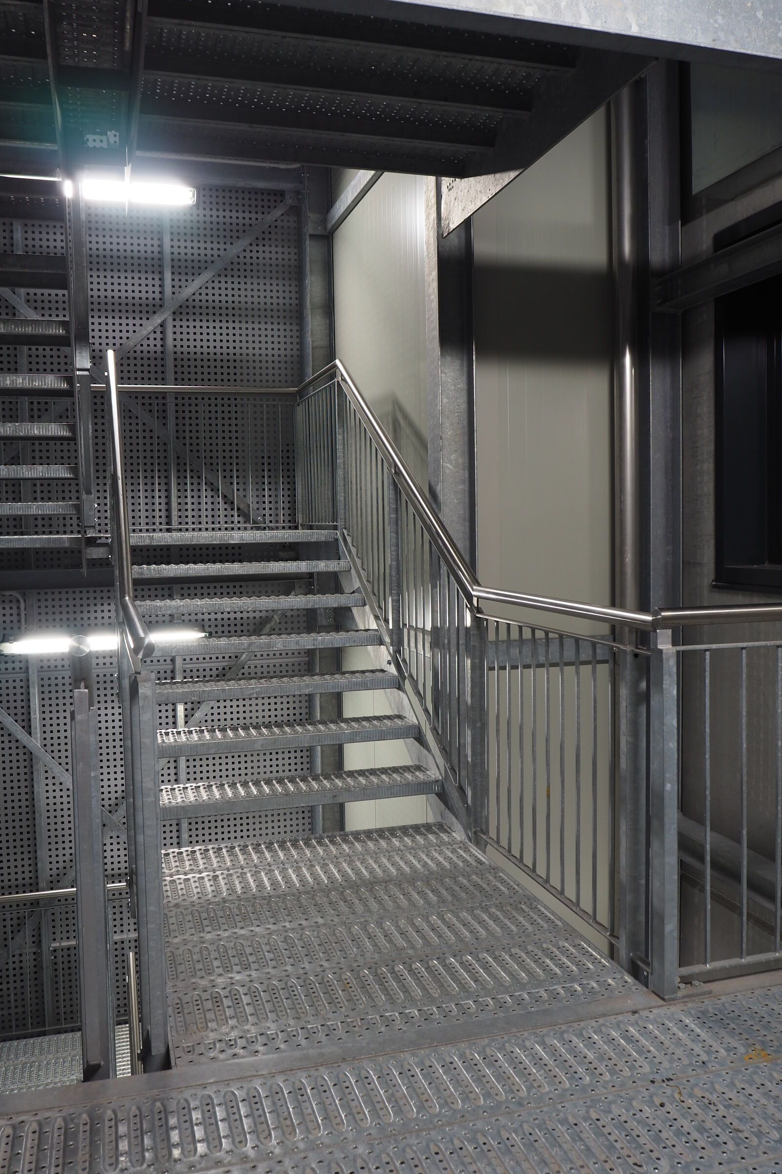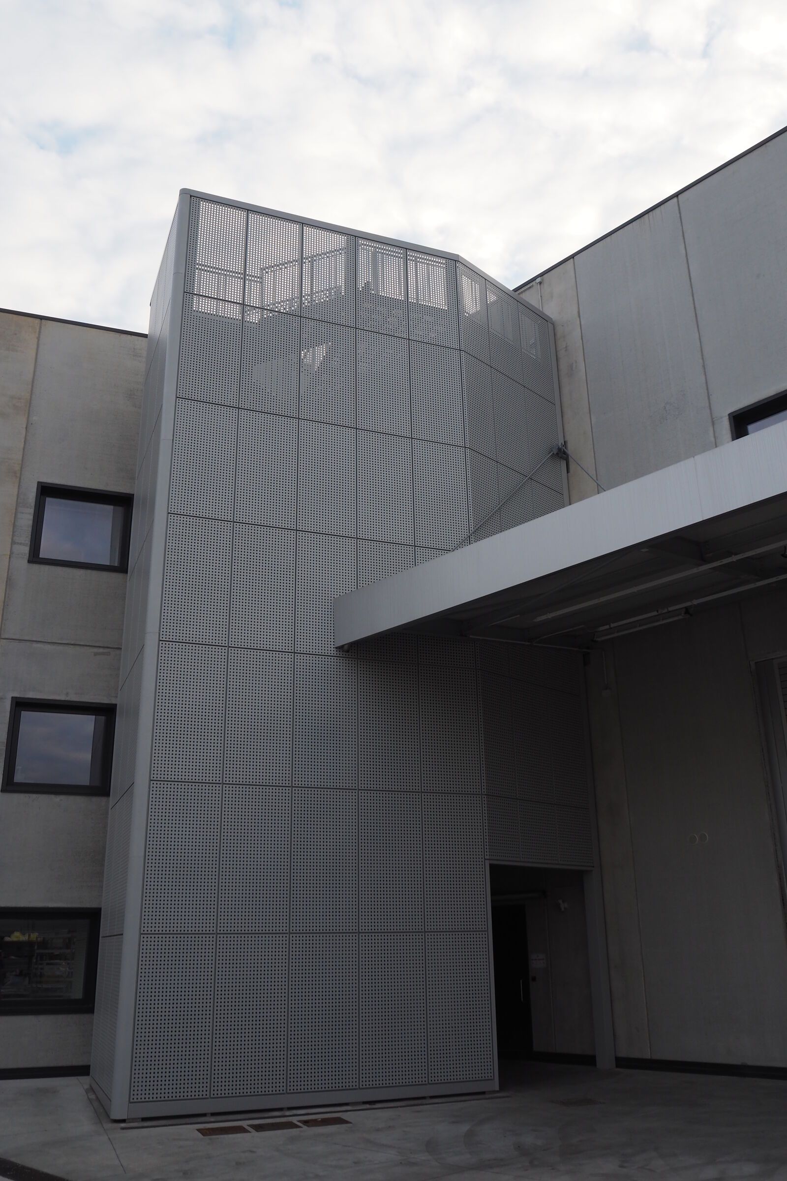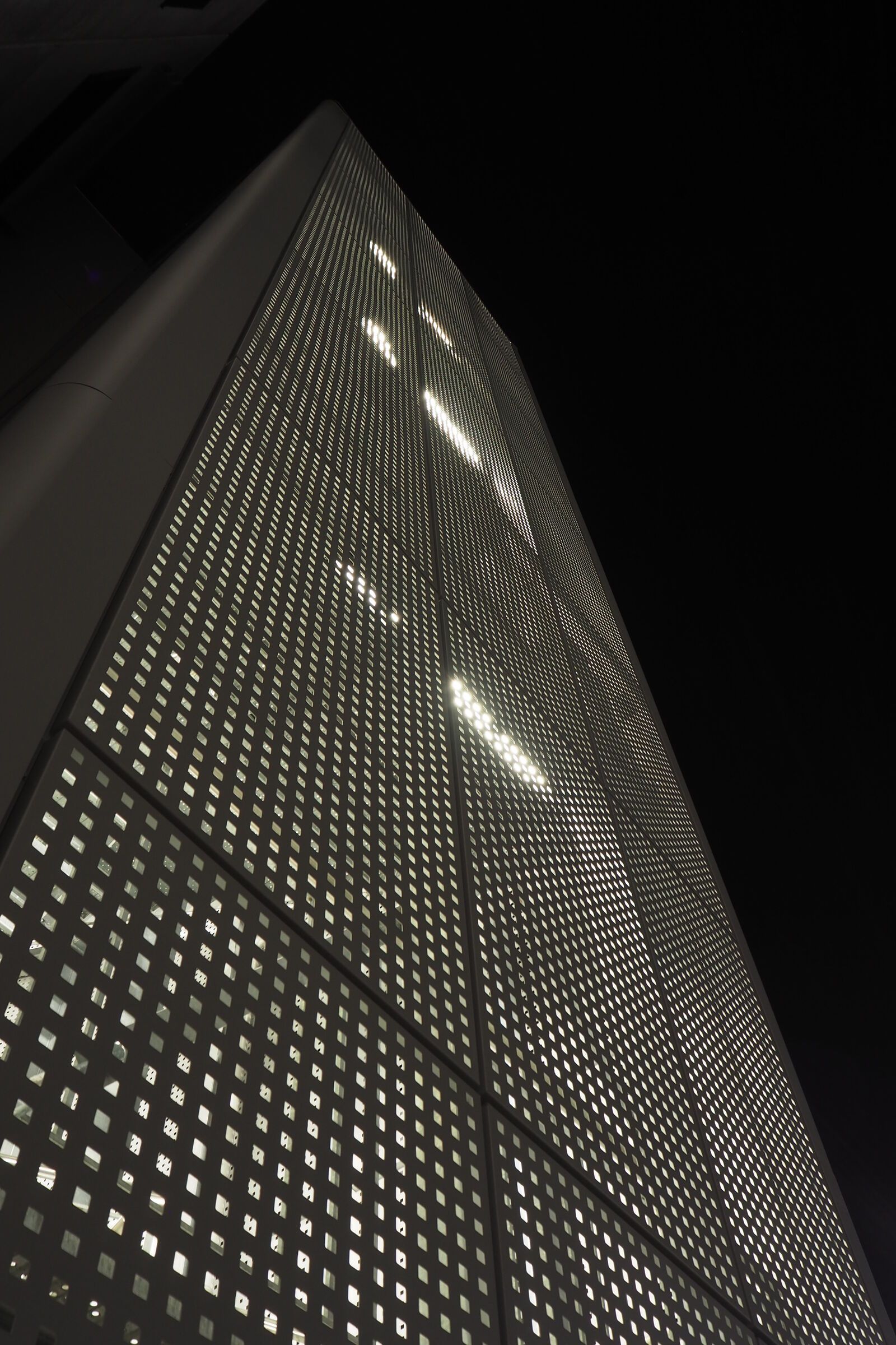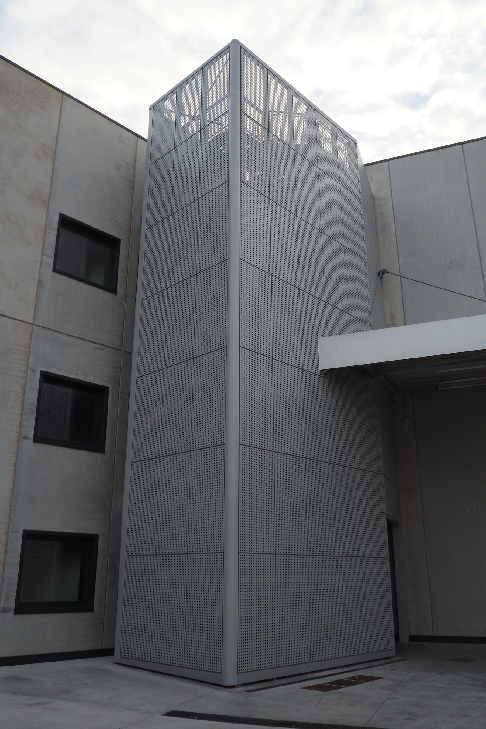 Per valorizzare l'estetica, la scala è stata rivestita con delle lamiere di alluminio forate, che la fanno intravedere solo nelle ore notturne grazie all'illuminazione con luci al neon.