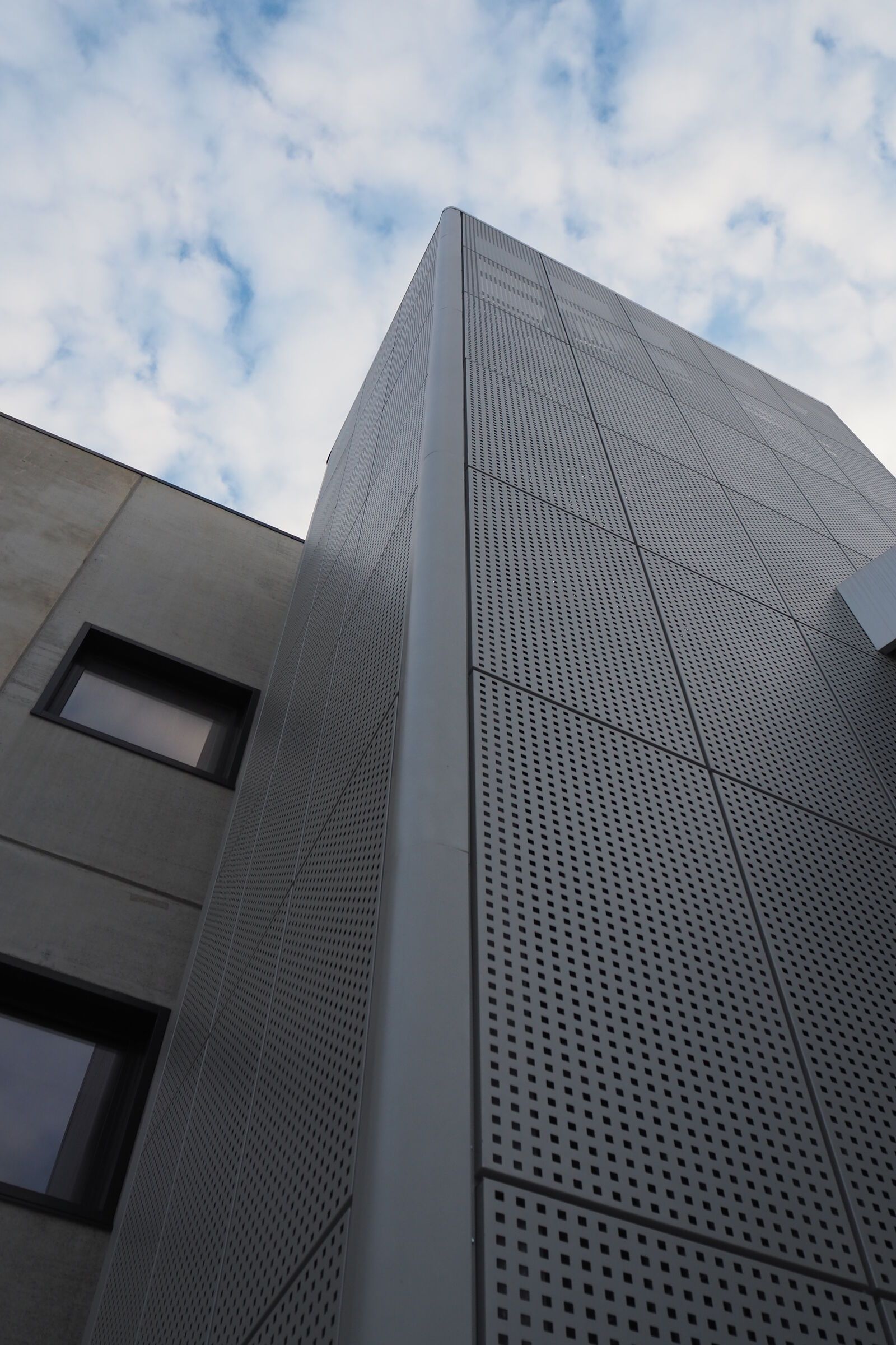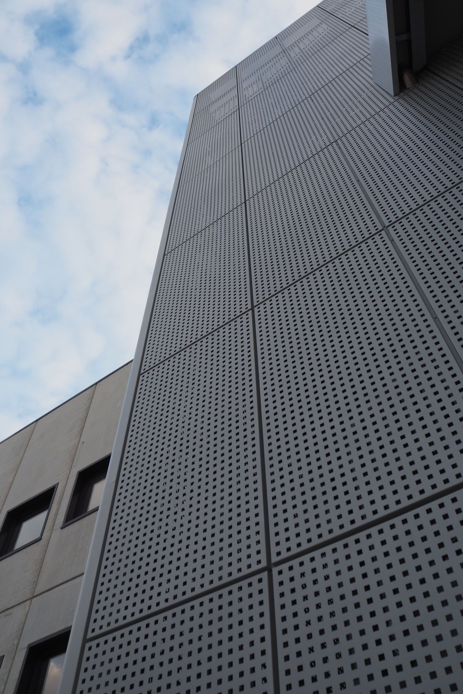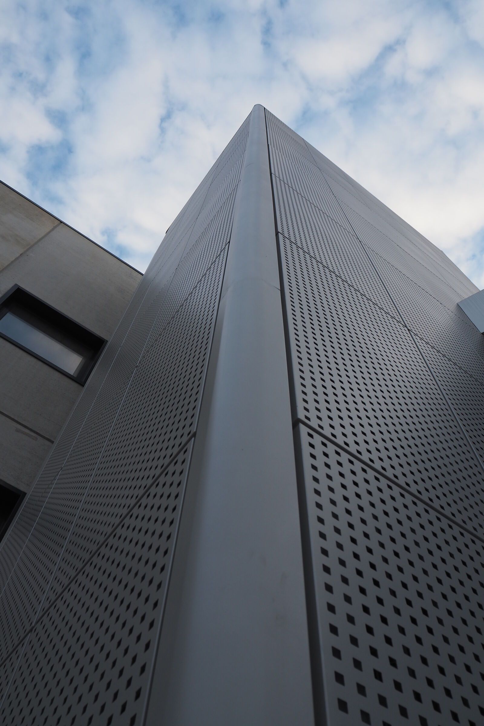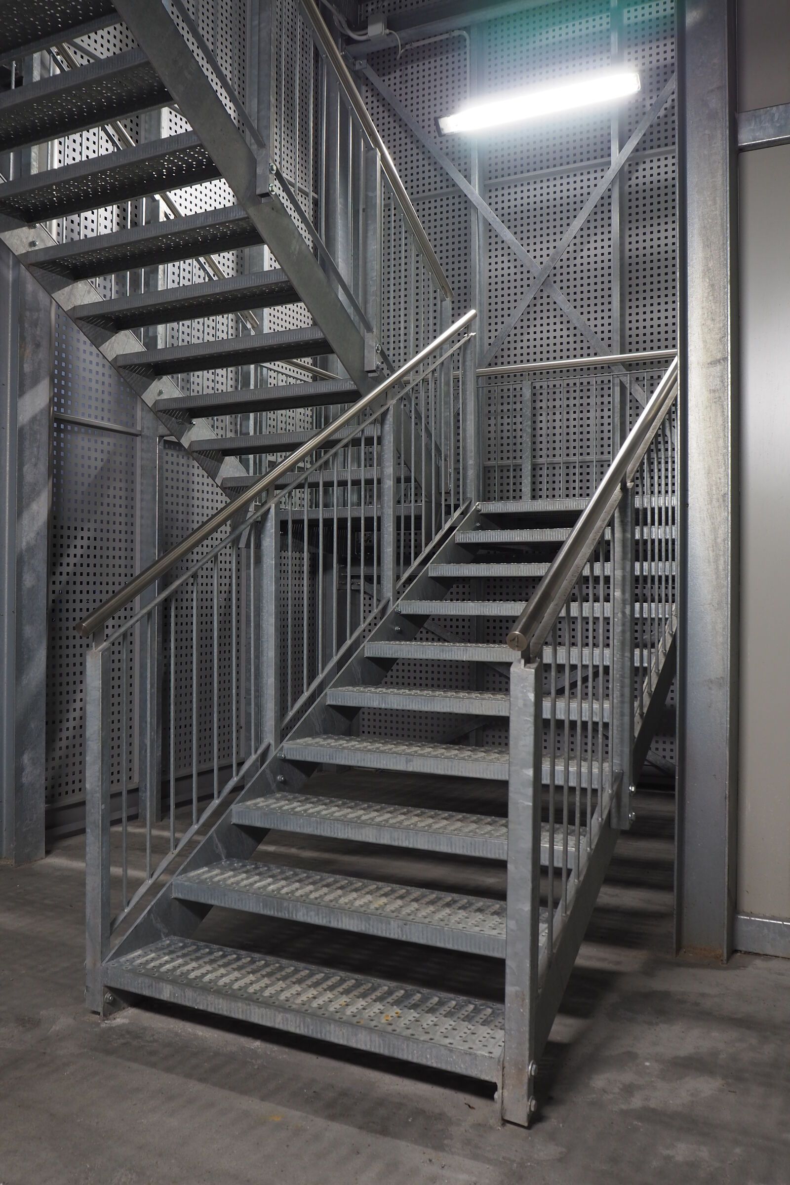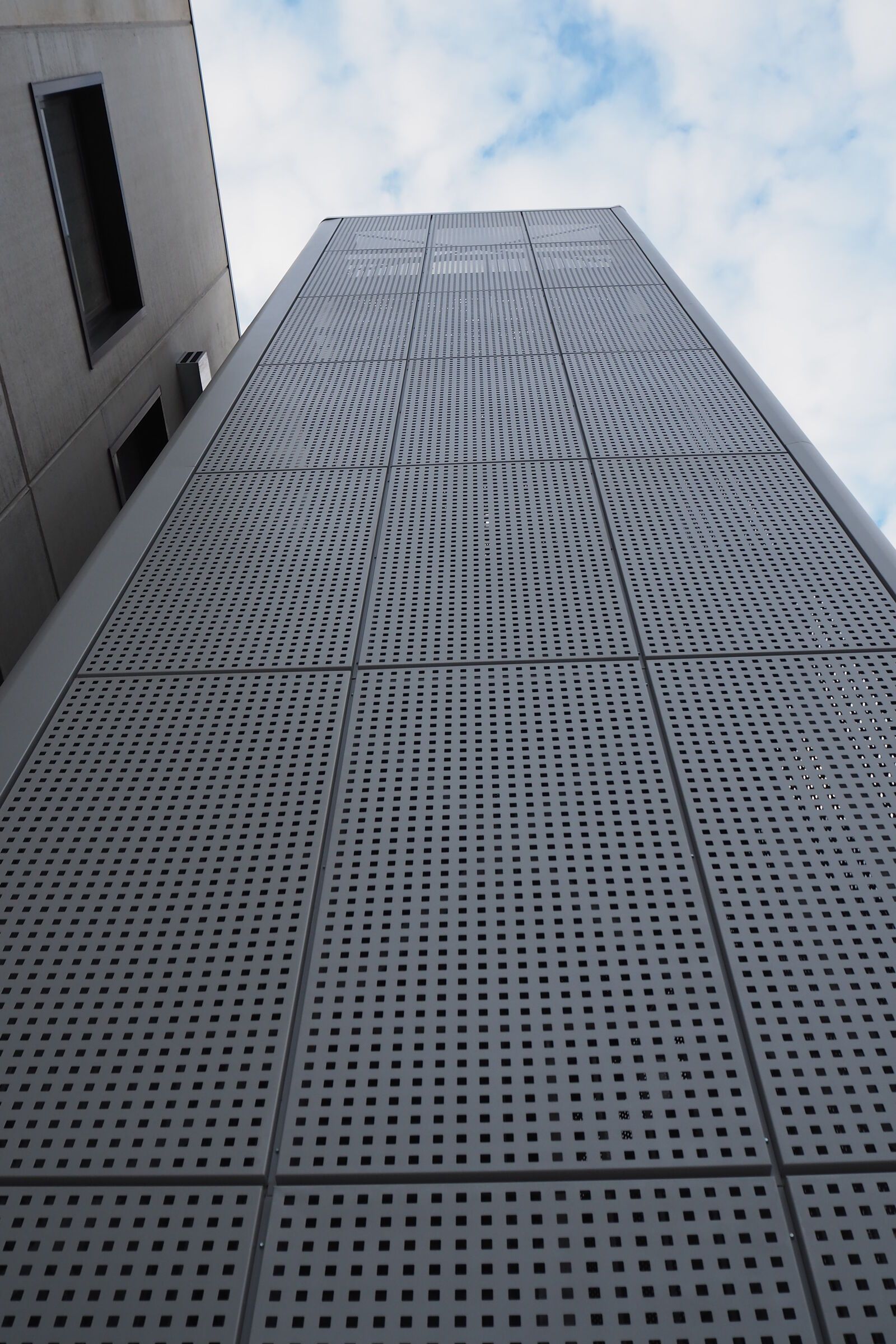 Per valorizzare l'estetica, la scala è stata rivestita con delle lamiere di alluminio forate, che la fanno intravedere solo nelle ore notturne grazie all'illuminazione con luci al neon.