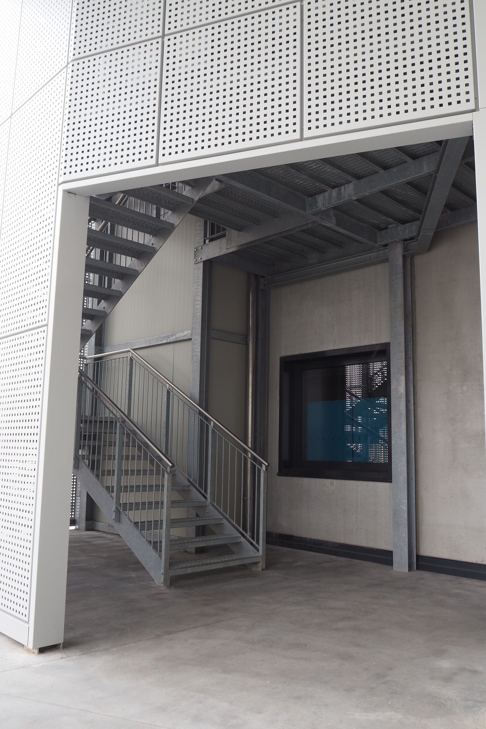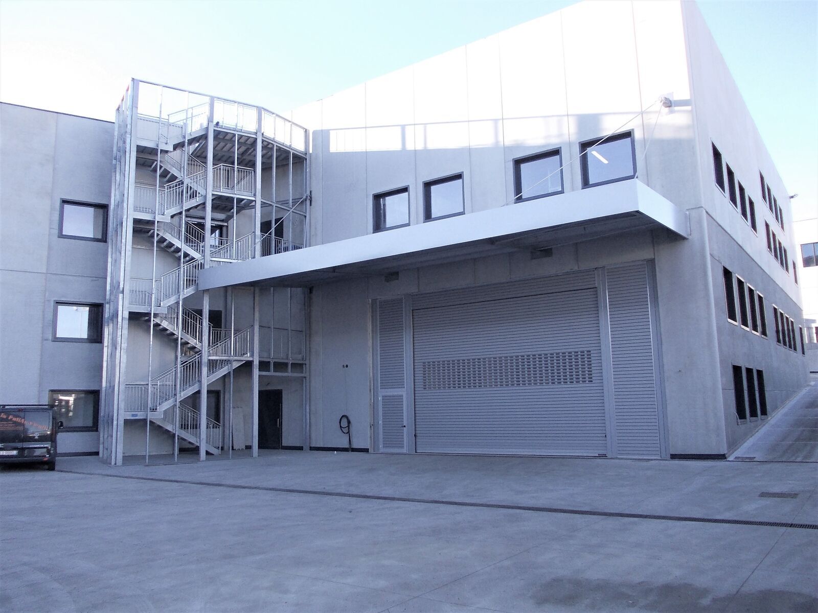 Tra tutte le opere matalliche fornite da Effevi Carpenteria per la nuova sede della Amer SpA, la più simbolica è stata la scala di sicurezza esterna che collega i 3 piani dell'edificio con un'annessa tettoia per il magazino delle materie prime.