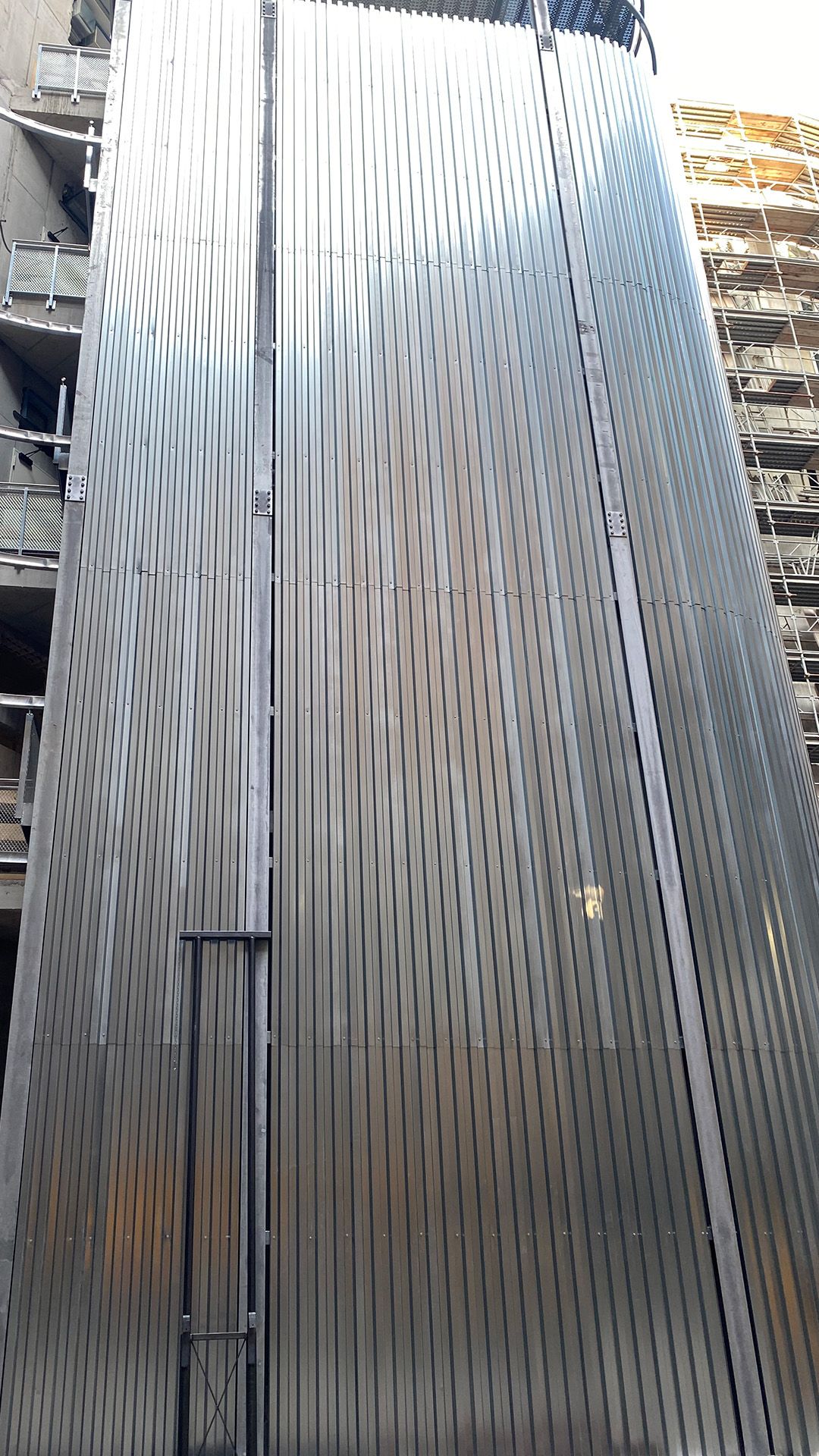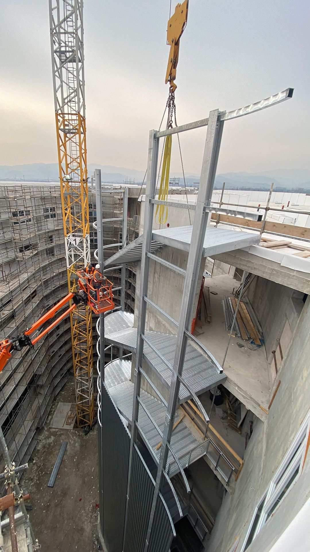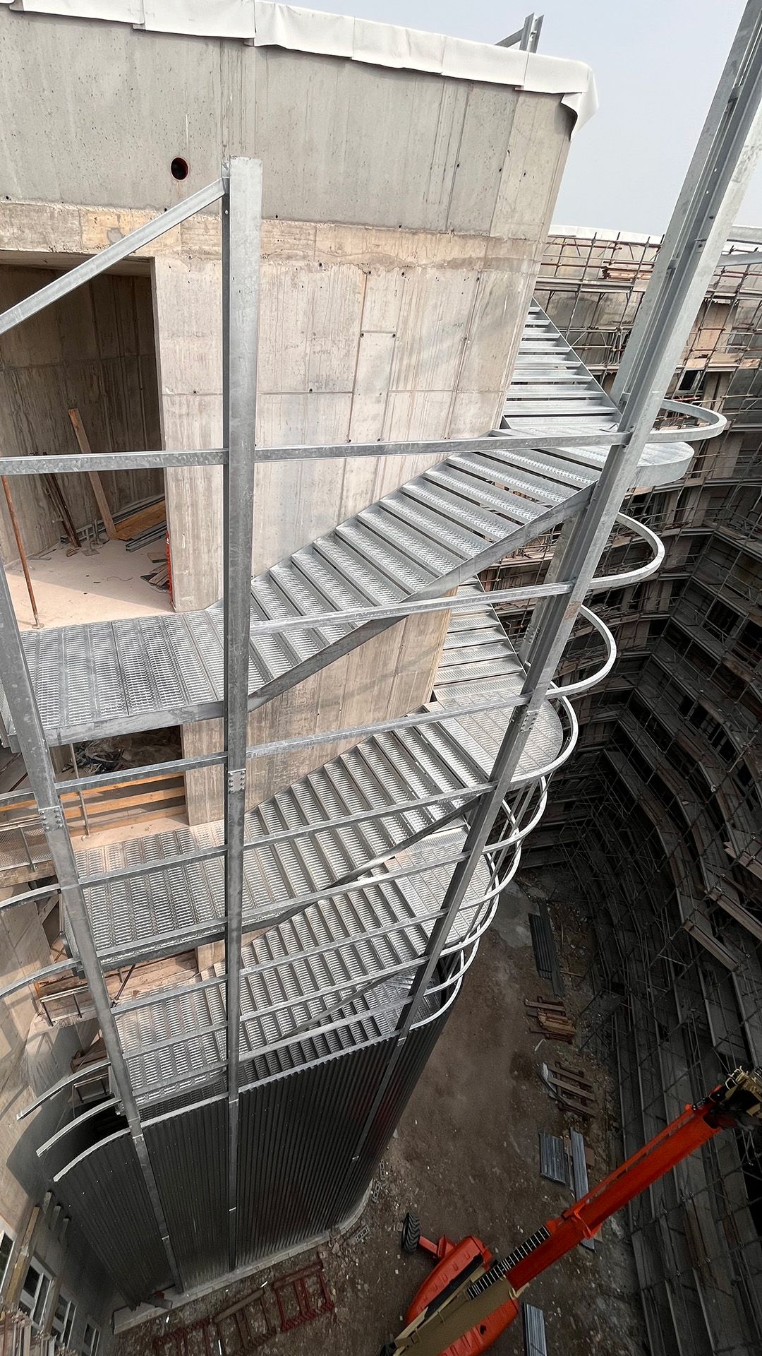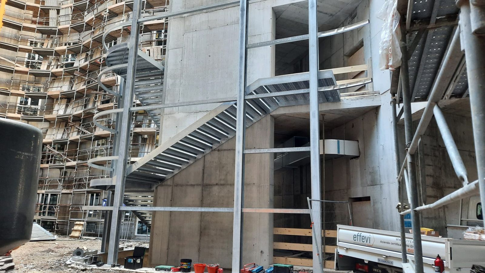 Questa scala di sicurezza rivestita realizzata per il Nuovo Ospedale di Montecchio Maggiore, sbarca ad una quota di +31,38 metri e ha una larghezza utile di 2 metri, in ottemperanza alle normative specifiche per gli ambienti ospedalieri.