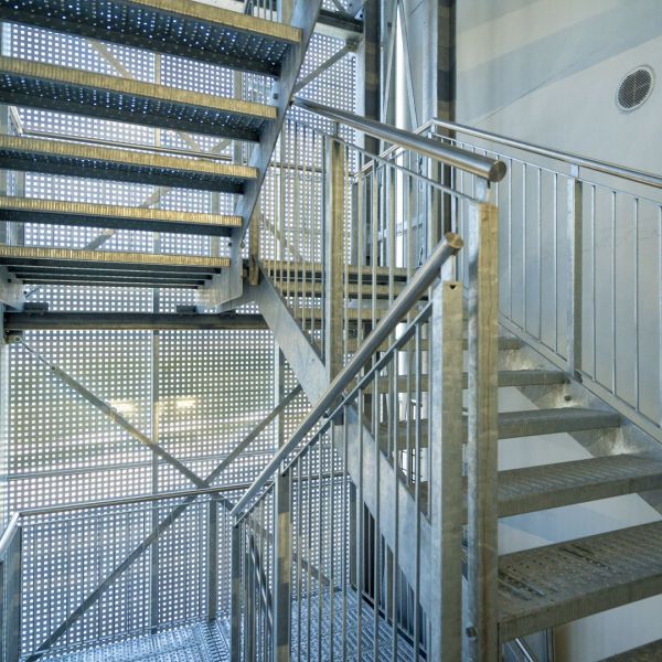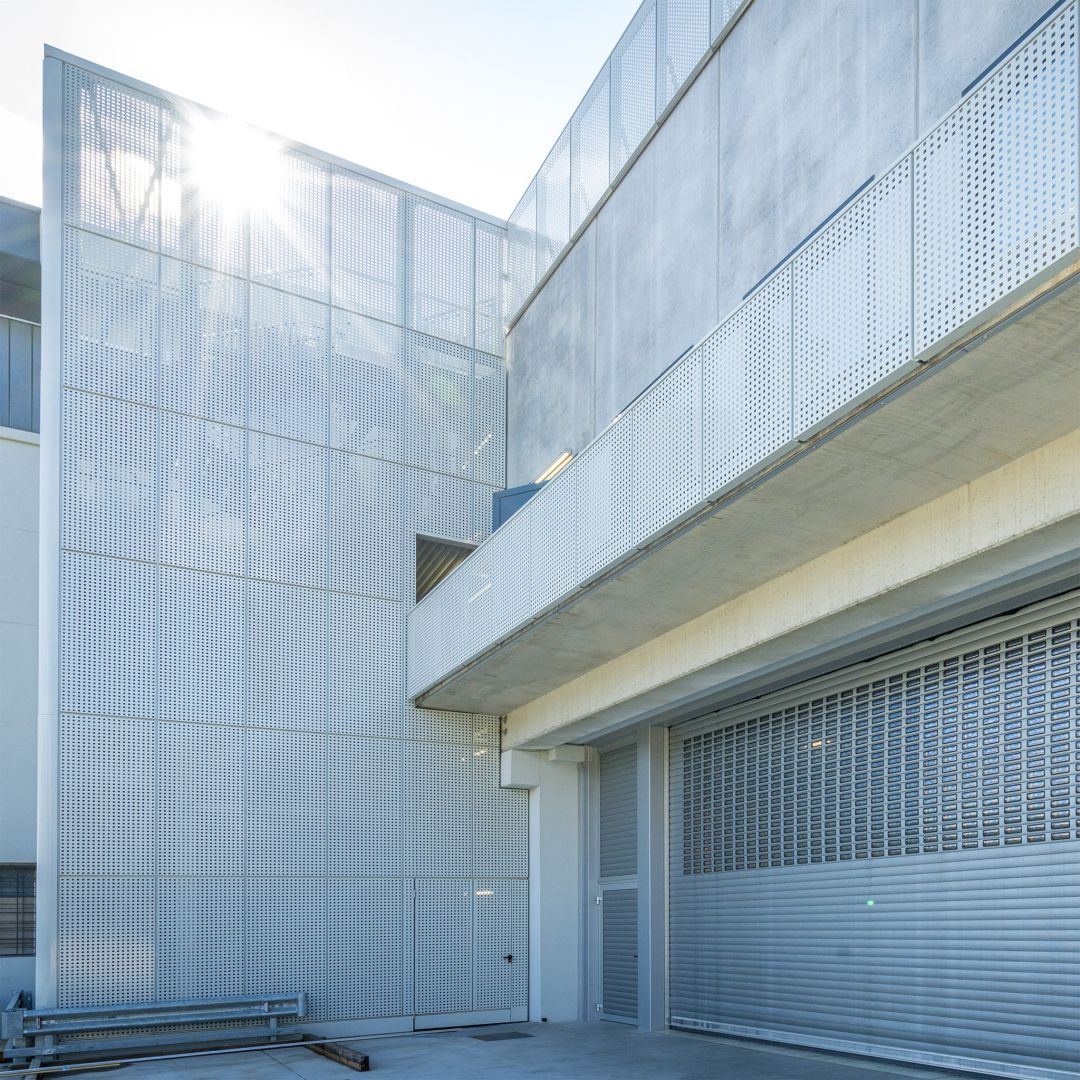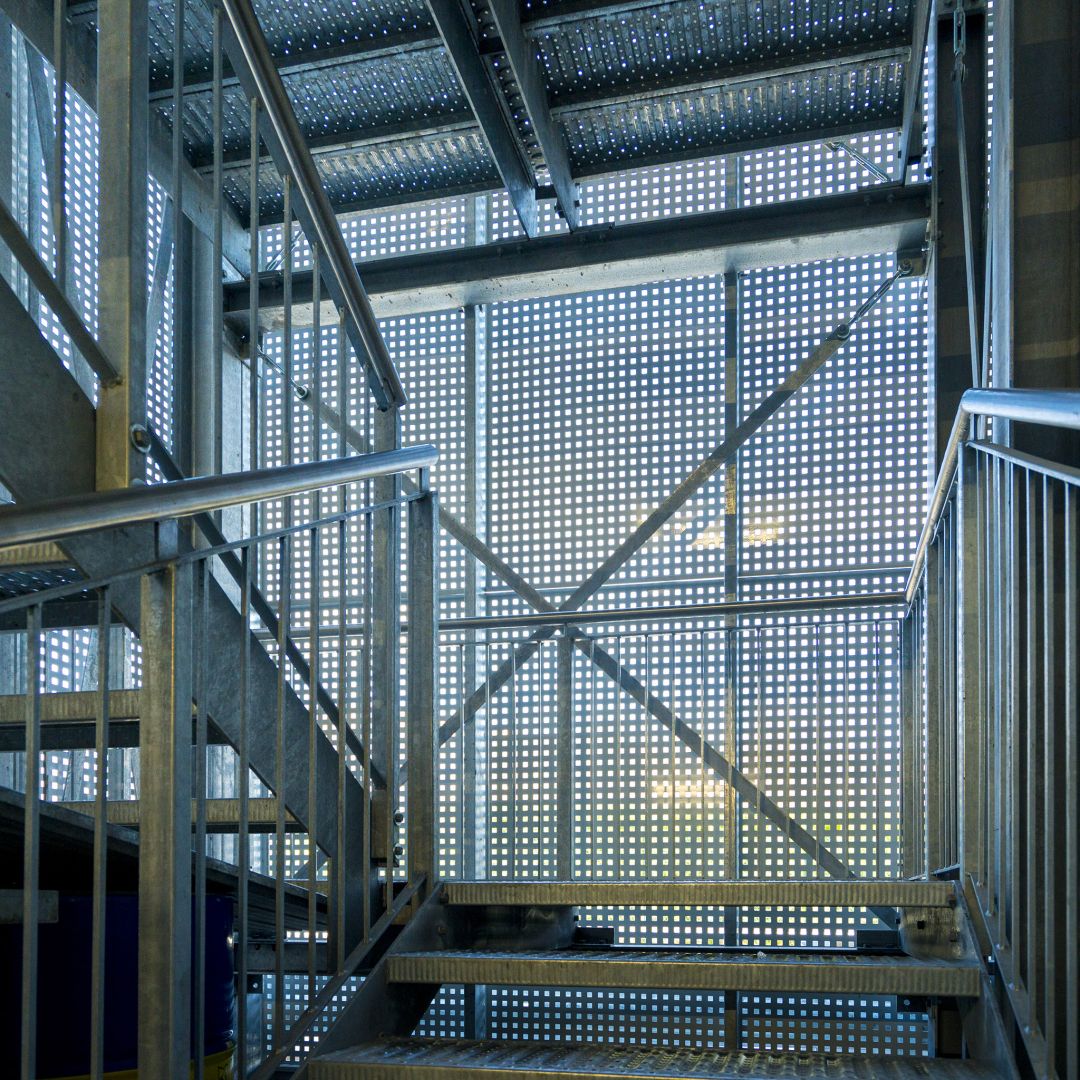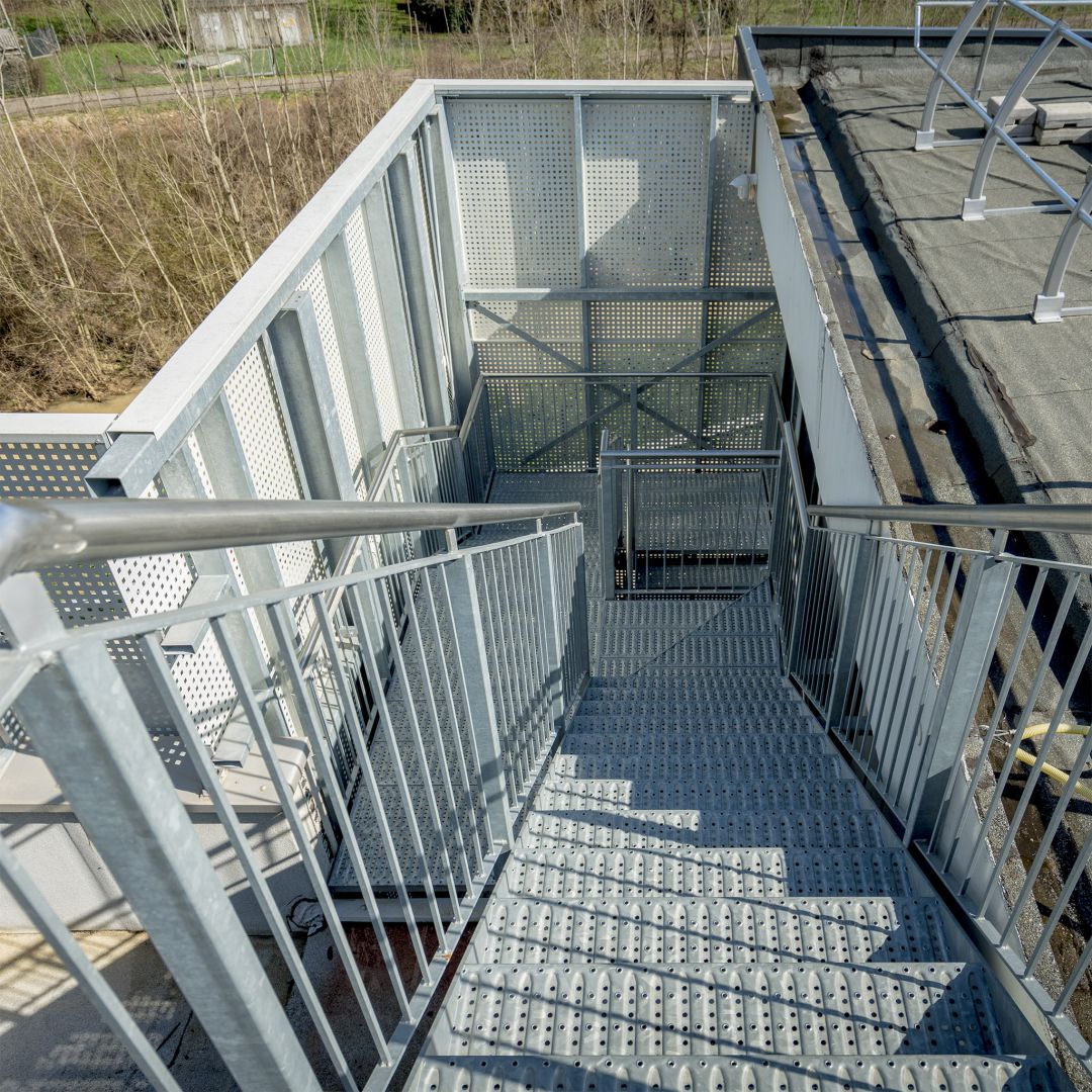 A fianco della tettoia presentata nell'ultimo post, per lo stesso cliente (SIR) abbiamo realizzato una scala di sicurezza alta 12,5 metri, rivestita con pannelli di lamiera di alluminio con fori quadrati.