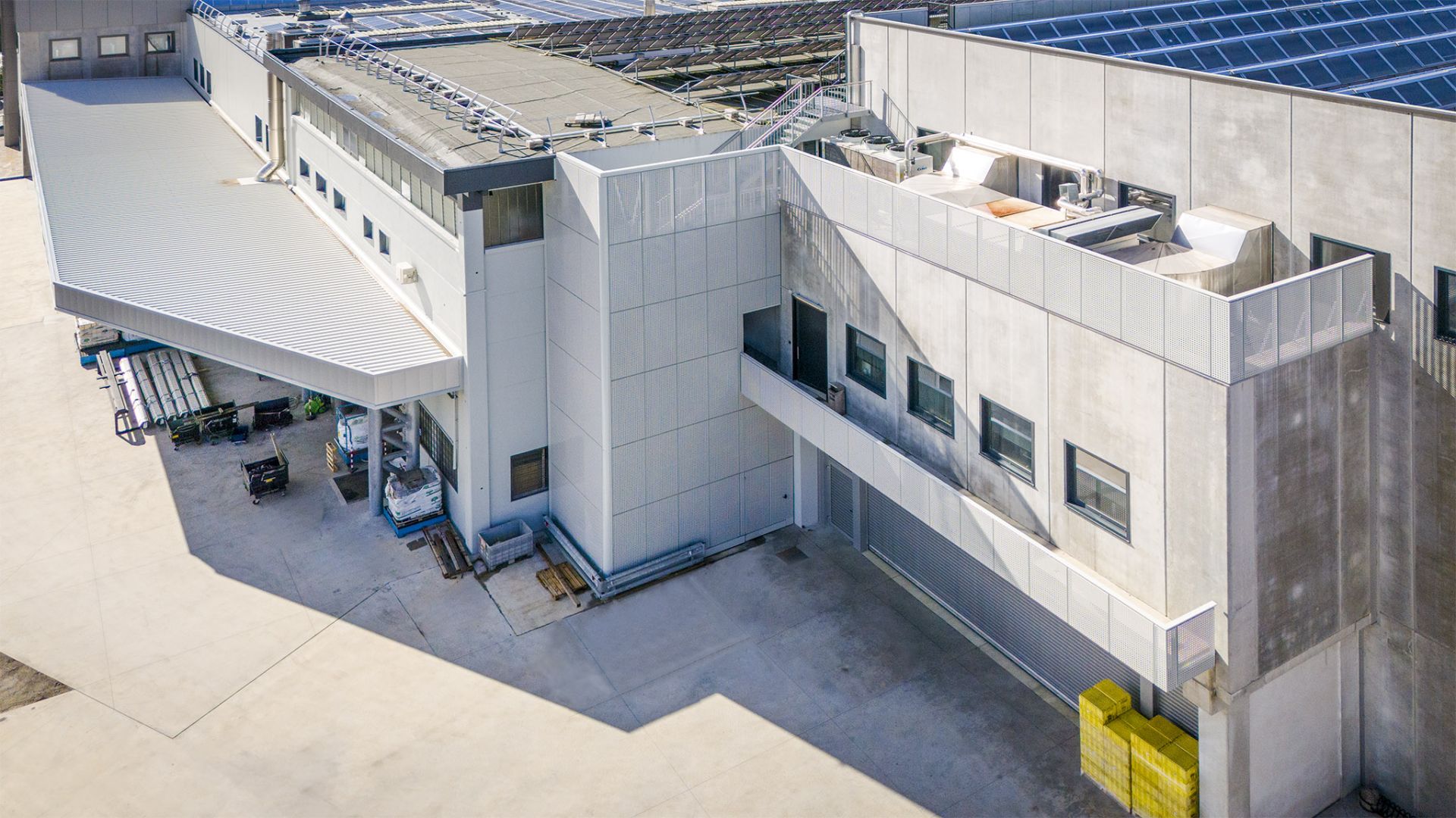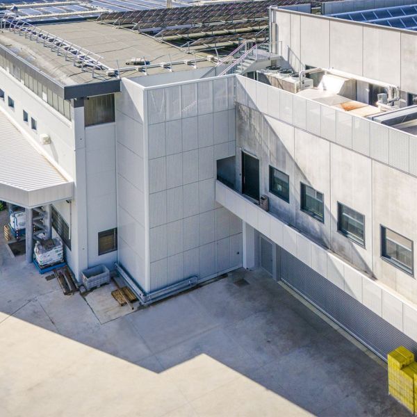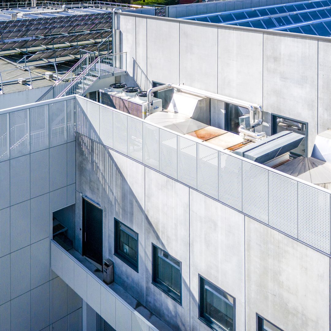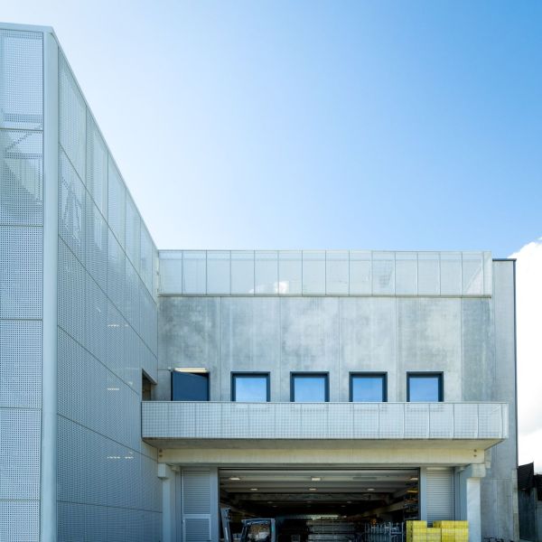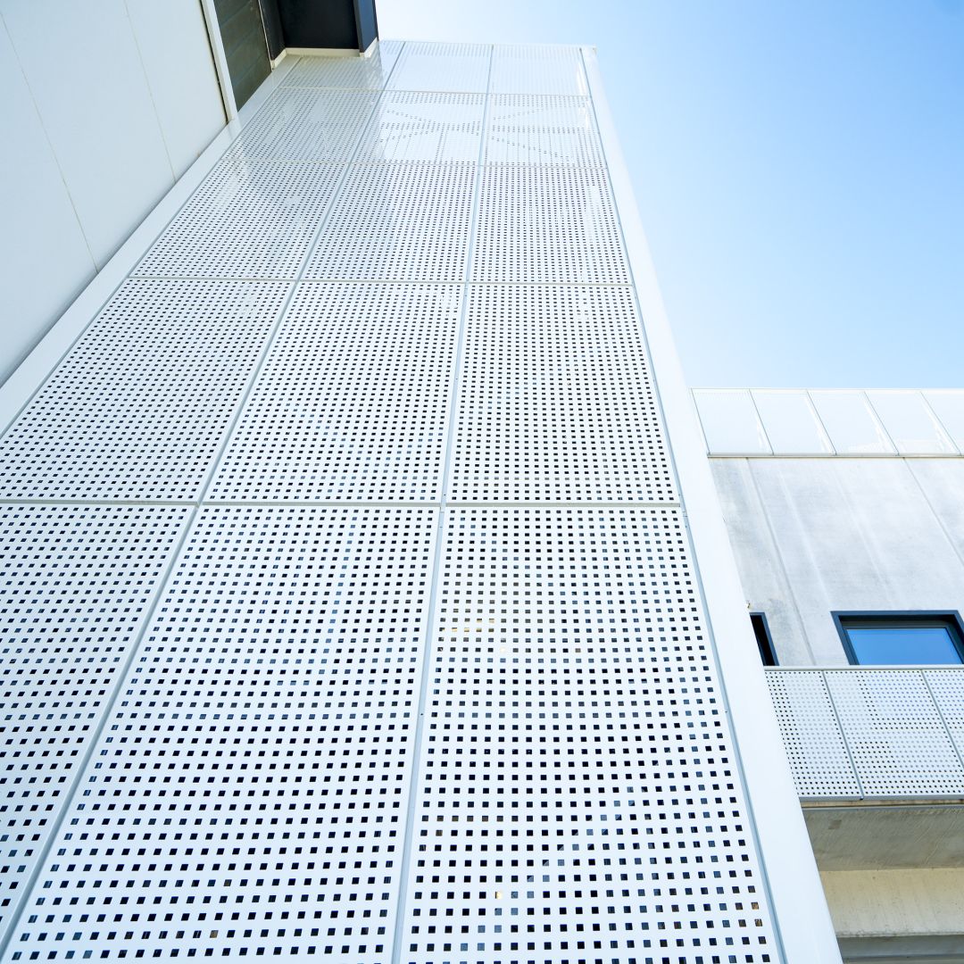A fianco della tettoia presentata nell'ultimo post, per lo stesso cliente (SIR) abbiamo realizzato una scala di sicurezza alta 12,5 metri, rivestita con pannelli di lamiera di alluminio con fori quadrati.